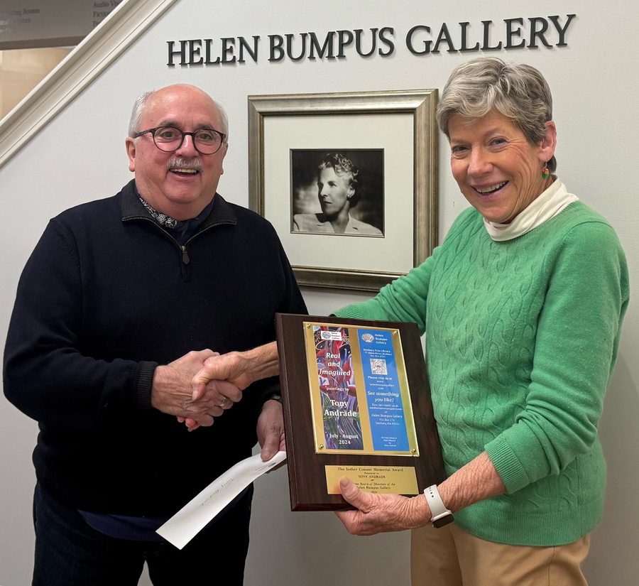 Helen Bumpus Gallery’s Board of Directors recently honored South Shore artist Tony Andrade with the 2024 Conant Award in special recognition of the exemplary artwork he exhibited in the Gallery last summer. "Real and Imagined--Paintings by Tony Andrade” featured two distinct bodies of work: realistic landscapes and whimsically abstract, imagined gardens.