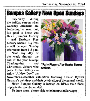 Especially during the holiday season when weekdays calendars are starting to max out, it’s good to know that Helen Bumpus Gallery – and Duxbury Free Library where HBG lives – will be open Sunday afternoons from 1-5 pm