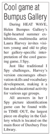 All answers in her I Spy picture identification game can be found within TIME OUT, the largest piece on display in the Gallery, which is located on the main floor of Duxbury Free Library.
