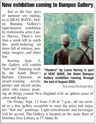 Starting Sept. 2, the gallery will exhibit “Salt Air” featuring work by the South Shore’s Barbara Chaisson, an award-winning acrylic painter and mixed media artist who enjoys painting all things coastal New England with an upbeat sense of color and design.