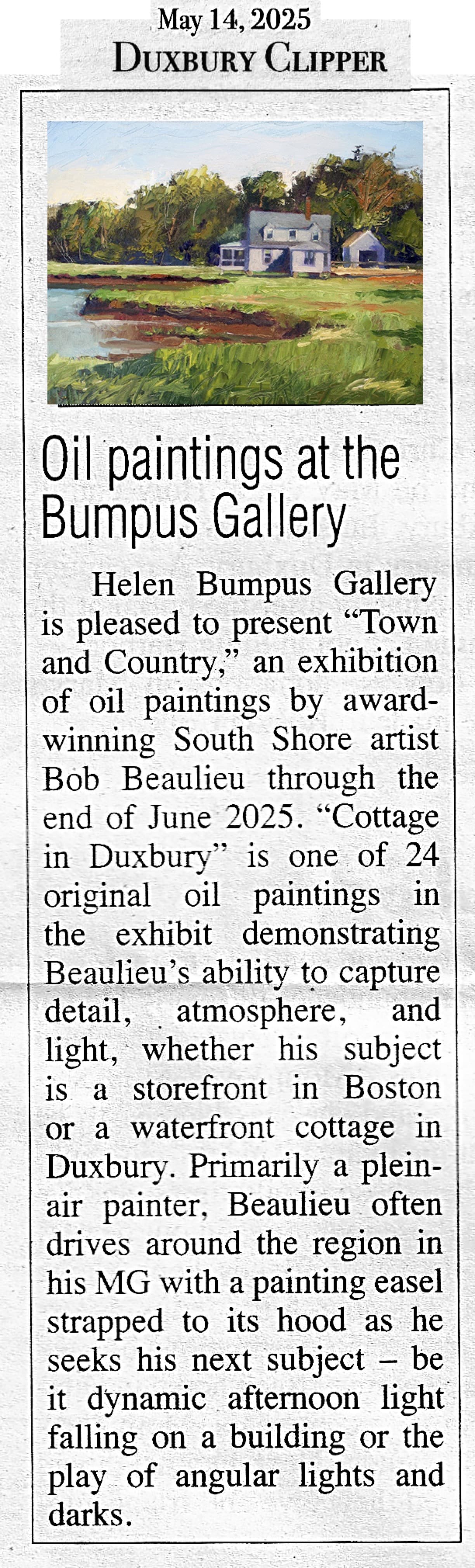 Helen Bumpus Gallery is pleased to present “Town and Country,” an exhibition of oil paintings by award-winning South Shore artist Bob Beaulieu through the end of June 2025. “Cottage in Duxbury” is one of 24 original oil paintings in the exhibit demonstrating Beaulieu’s ability to capture detail, atmosphere, and light, whether his subject is a storefront in Boston or a waterfront cottage in Duxbury.