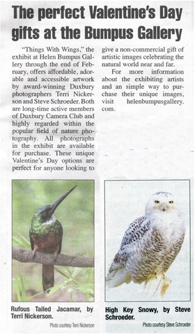 “Things With Wings,” the exhibit at Helen Bumpus Gallery through the end of February, offers affordable, adorable and accessible artwork by award-winning Duxbury photographers Terri Nickerson and Steve Schroeder. Both are long-time active members of Duxbury Camera Club and highly regarded within the popular field of nature photography.