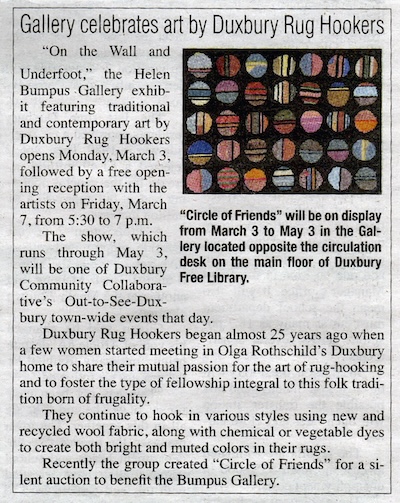 “On the Wall and Underfoot,” the Helen Bumpus Gallery exhibit featuring traditional and contemporary art by Duxbury Rug Hookers opens Monday, March 3, followed by a free opening reception with the artists on Friday, March 7, from 5:30 to 7 p.m.