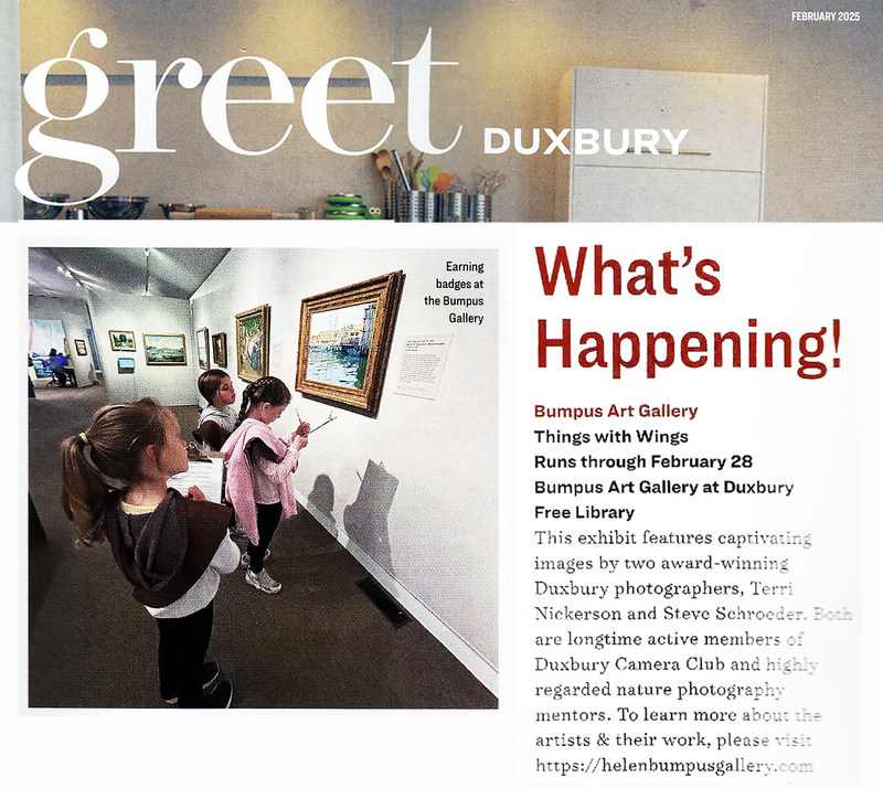 This exhibit features captivating images by two award-winning Duxbury photographers, Terri Nickerson and Steve Schroeder. Both are longtime active members of Duxbury Camera Club and highly regarded nature photography mentors. To learn more about the artists & their work, please visit https://helenbumpusgallery.com