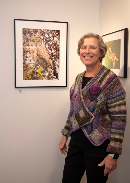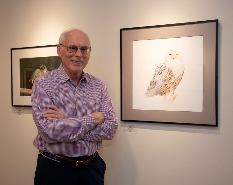 WINGING IT. Photographer Steve Schroeder next to his photo of a snowy owl, on display at the Helen Bumpus Gallery. Schroeder describes himself as “a bird photographer not a birder.” He loves nature and outdoor photography