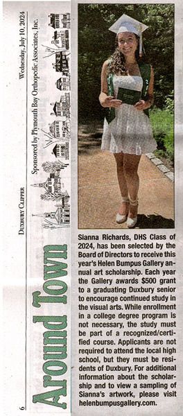 Sianna Richards, DHS Class of 2024, has been selected by the Board of Directors to receive this year’s Helen Bumpus Gallery annual art scholarship. Each year the Gallery awards a $500 grant to a graduating Duxbury senior to encourage continued study in the visual arts. While enrollment in a college degree program is not necessary, the study must be part of a recognized/certified course. Applicants are not required to attend the local high school, but they must be residents of Duxbury.