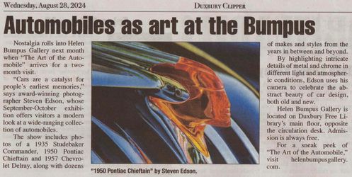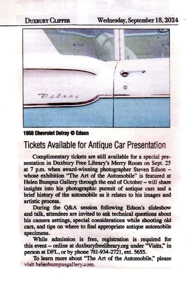 Complimentary tickets are still available for a special pre- sentation in Duxbury Free Library's Mery Room on Sept. 25 at 7 p.m. when award-winning photographer Steven Edson - whose exhibition "The Art of the Automobile" is featured at Helen Bumpus Gallery through the end of October - will share insights into his photographic pursuit of antique cars and a brief history of the automobile as it relates to his images and artistic process.