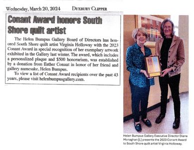 Conant Award honors South Shore quilt artist.  The Helen Bumpus gallery Board of Directors has honored South Shore quilt artist Virginia Hollowy with the 2023 Conant Award in special recognition of her exemplary artwork exhibited in the Gallery last winter.  The award, which includes a personalized plaque and $500 honorarium, was established by a donation from Esther Conant in honor of her friend and gallery namesake, Helen Bumpus.
